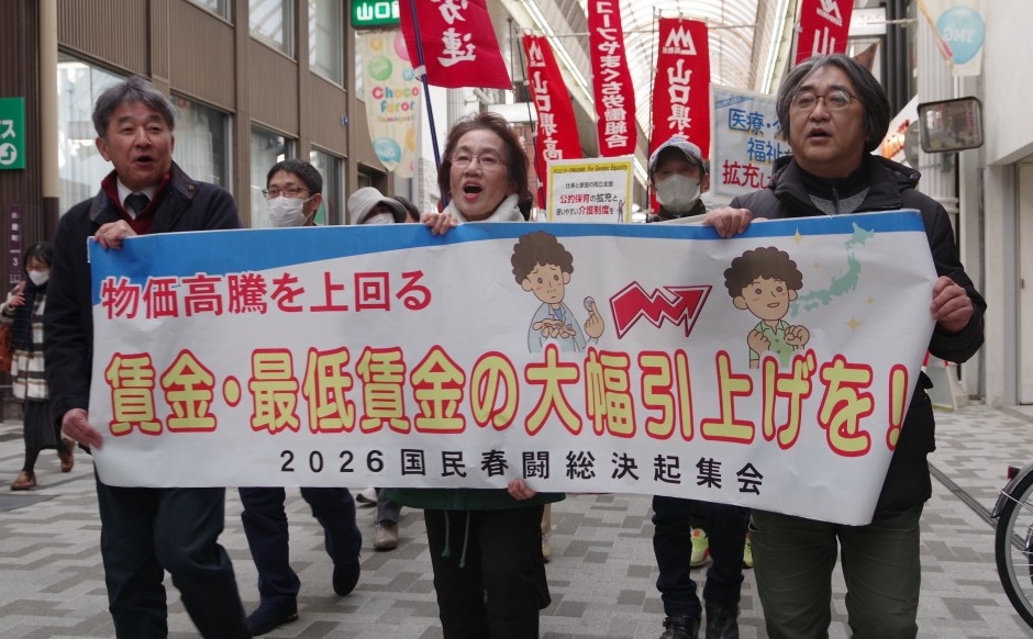 2026国民春闘山口県総決起集会が3月7日、「低賃金と物価高騰から生活をまもる大幅賃上げ・底上げを!軍拡・増税でなく社会保障の充実を!」を掲げ、山口県教育会館で開催されました。石田県労連議長は「日本は生産性が低いから賃金が上がらない」のではなく、生産性が上がっているのに、実質賃金が上がっていない」とBNPパリバ証券チーフエコノミスト河野龍太郎さんの言説を紹介してあいさつ。生産性が上がった分を従業員にきちんと分配しないから成長できなくなっているのが日本であり、その背景に「株主利益の最大化」を追求する企業行動があること、このコスト削減の最たるものが非正規雇用の多用だと指摘。26春闘で大幅賃上げ・底上げを実現し、生活改善できる賃上げをかちとろうと呼びかけました。その後、参加者は「労働組合とは」をテーマに、労働組合の意義と役割や「対話と学びあい」を軸に仲間を増やしていくことの重要性について学びました。集会は集会アピールを採択し、市内をパレードしました。26春闘は3月11日の回答、翌日12日に統一行動を予定しています。